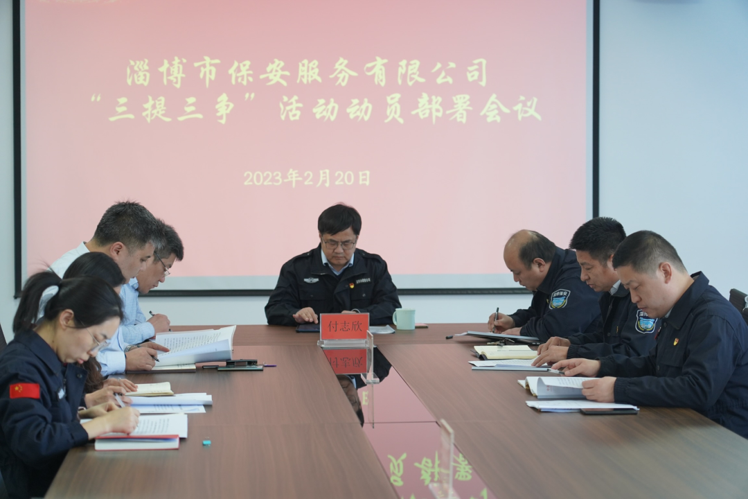 2月20日下午,淄博市保安服務(wù)有限公司召開黨委會議,學(xué)習(xí)全市“三提三爭”活動動員大會精神,傳達《市國資委黨委關(guān)于開展“三提三爭”活動的通知》要求,并對下一步工作進行研究部署。公司黨委班子全體成員參加會議,黨委書記、董事長付志欣主持會議。