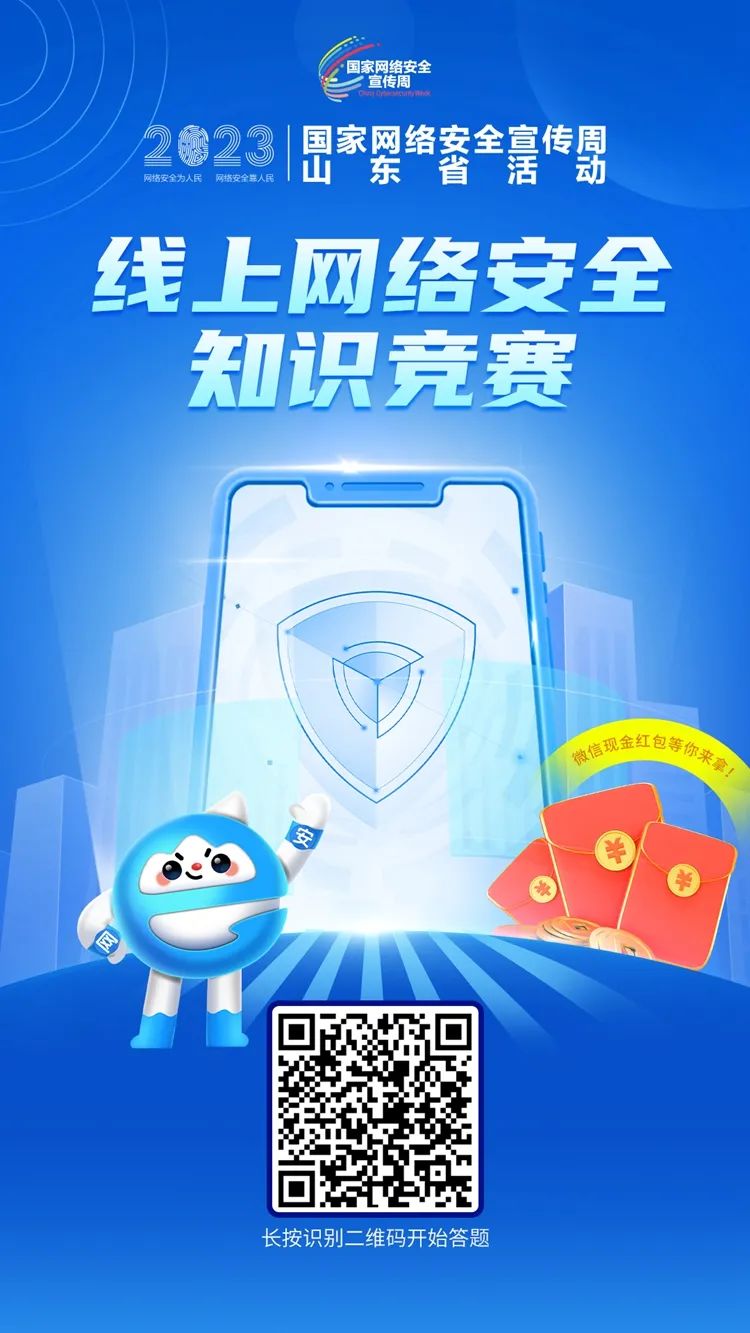 為面向廣大網(wǎng)民普及網(wǎng)絡安全知識,引導網(wǎng)民樹立正確網(wǎng)絡安全觀念,提升網(wǎng)民防護意識,2023國家網(wǎng)絡安全宣傳周山東省活動,線上網(wǎng)絡安全知識競賽即將上線,輕松答題贏紅包,答題活動時間為9月10日—17日,微信掃描下方二維碼即可進入?yún)⑴c。